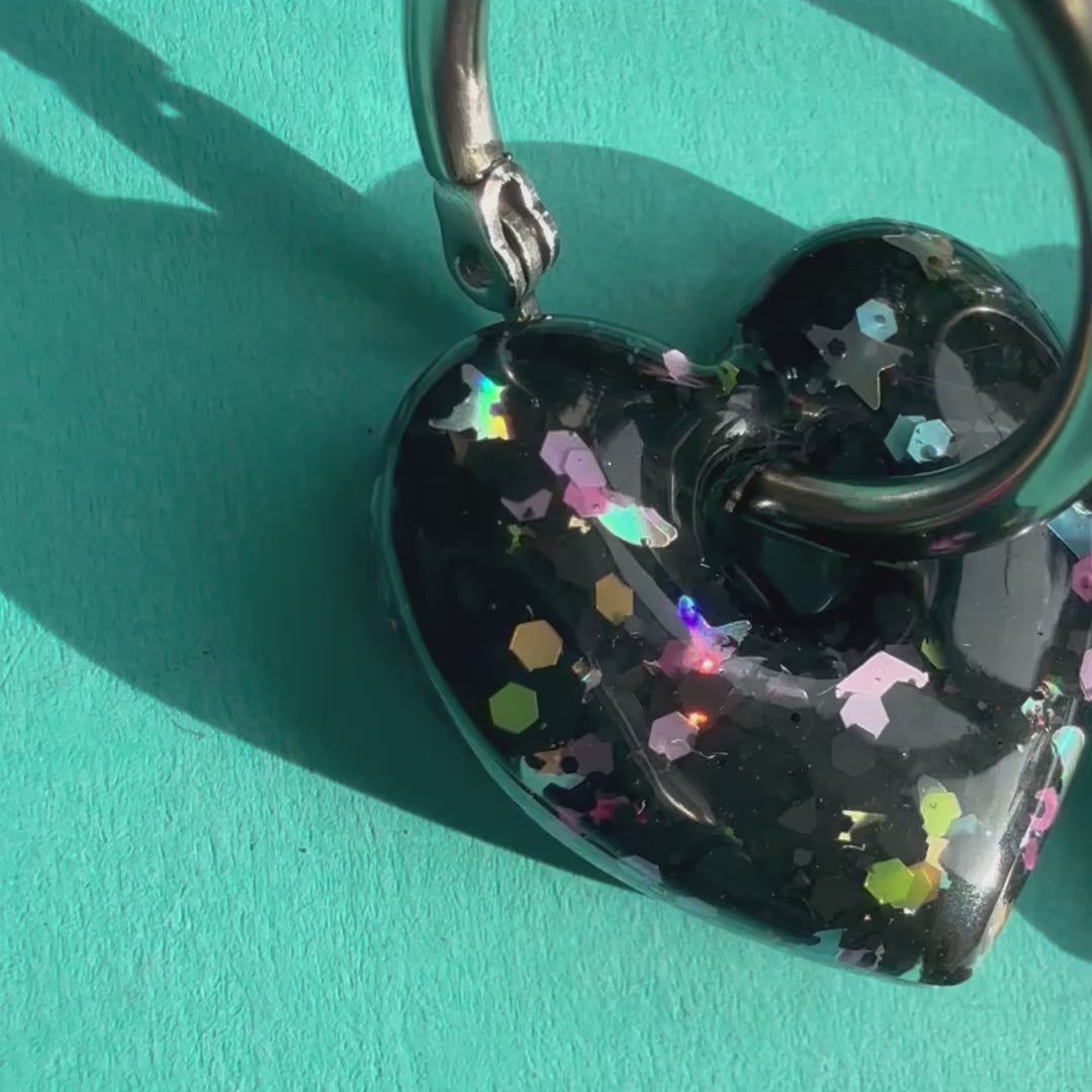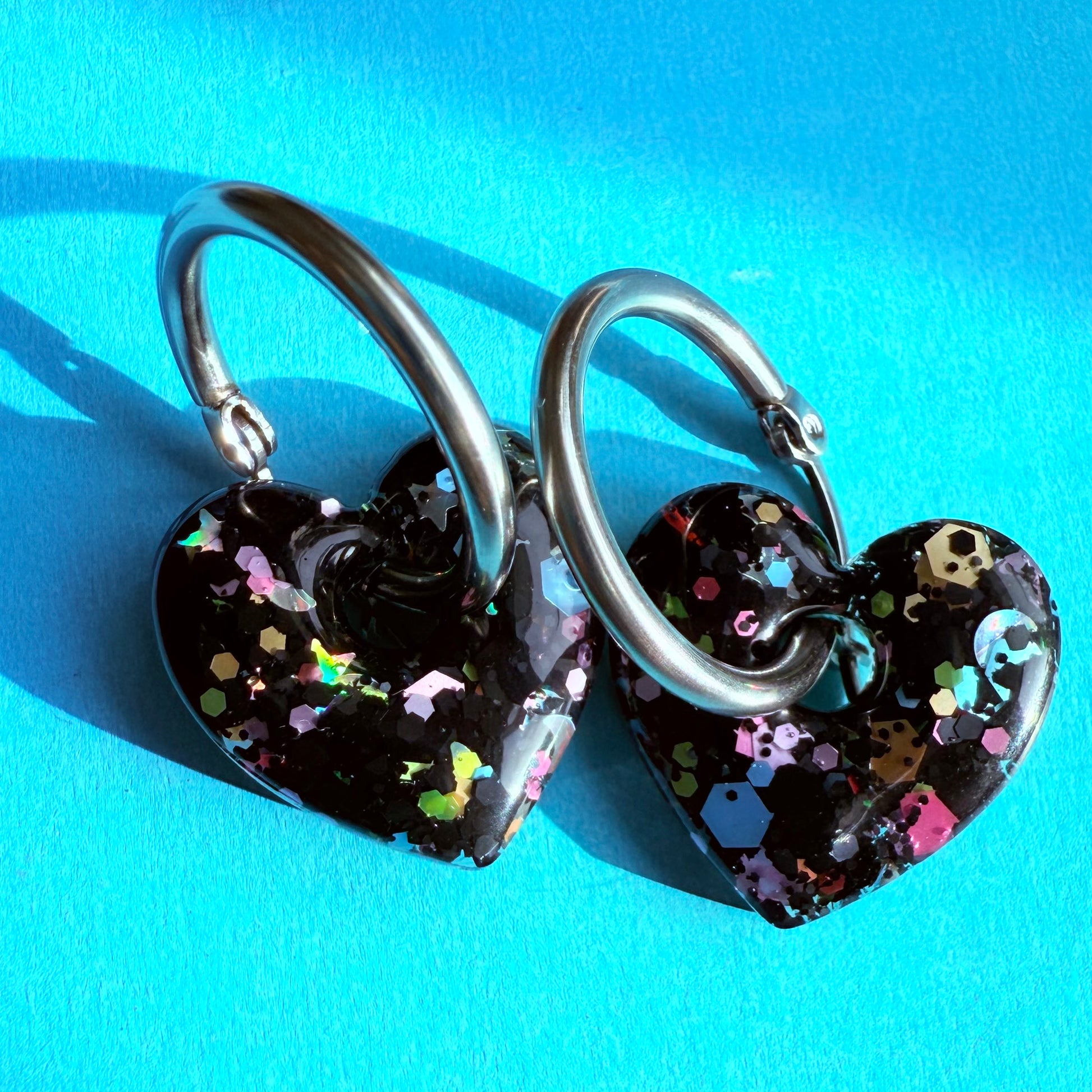 Put a spell on your style with our Hocus Pocus Heart Hoops. These silver-plated hoops feature a magical mix of Halloween colours in resin hearts, perfect for adding a touch of magic to any outfit. Cast a spell with these quirky and playful earrings.