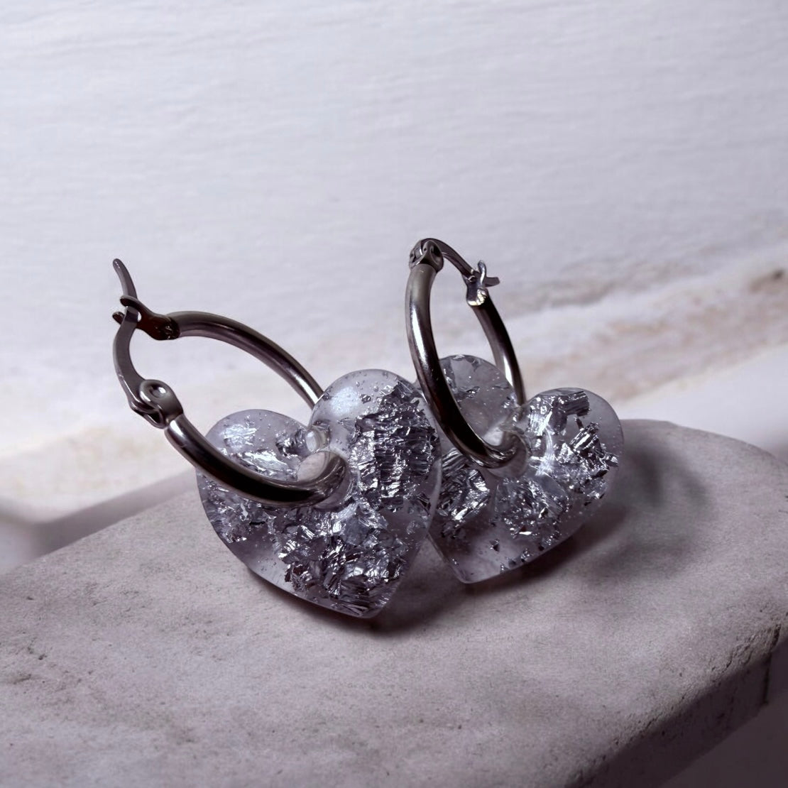 Dazzle your ears with the Silver Flake Hoops! These beauties feature resin hearts sprinkled with silver flakes, dangling from shiny silver-plated hoops. Perfect for adding a pop of glam to your outfit—because who doesn’t want to sparkle like a disco ball? (Just remember, no dancing on tables… yet!)