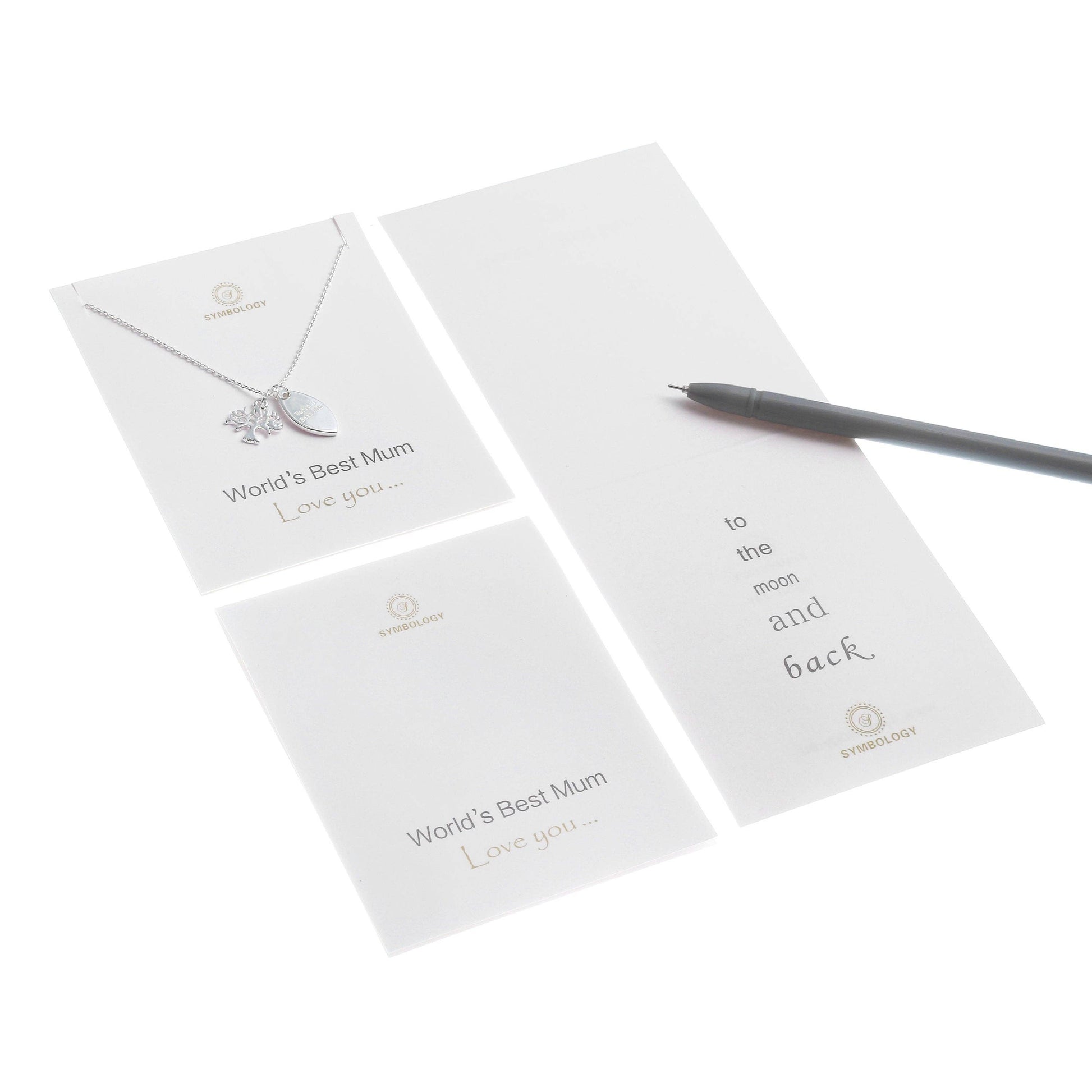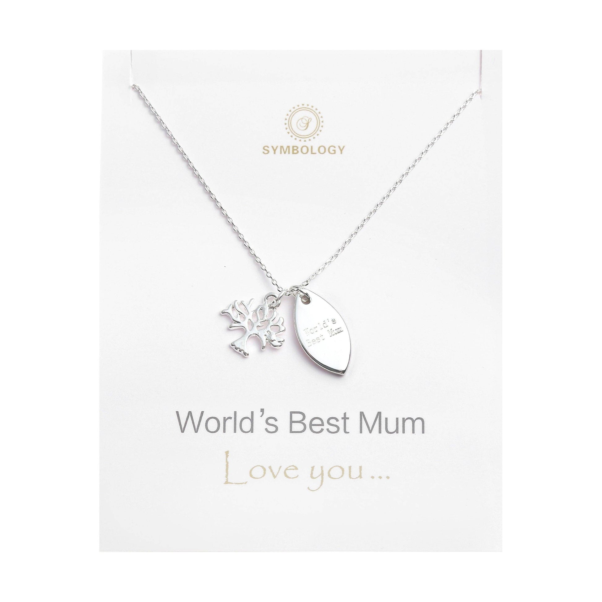 This beautiful silver plated necklace comes with a Sliver Tree of Life pendant symbol and 'World's Best Mum' tag charm. It is paired with a simple and beautiful card with the message 'To the moon and back'. It is both sentimental and stylish, making this the perfect gift for loving Mum or a treat for yourself. Necklace Dimensions: Charm Width: 15mm; Tag Length: 20mm; Circumference: 44-48cm Metal Type: Brass with Sterling silver Plated Allergen-free, Nickel-Free, Cadmium-Free, Lead-Free From one of the SYMBOLOGY family - Circle of Love Collection - made with love. ∙ ∙ ∙ ∙ ∙ G I F T S ∙ ∙ ∙ ∙ ∙ Each piece is individually wrapped in a branded SYMBOLOGY gift box.